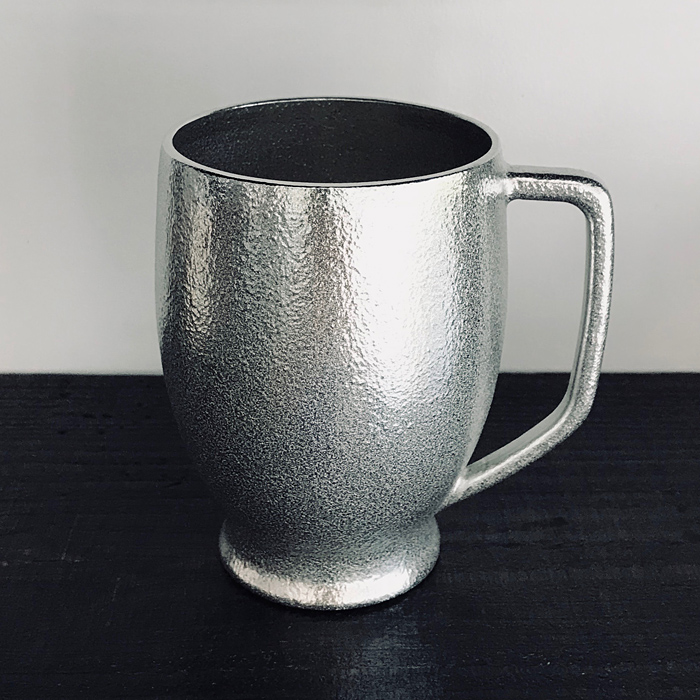 どうです?威風堂々としたビアマグです。 約600cc入ります。 どうぞ美味しいビールをこの錫のビアマグでゴクゴク飲んでください。 鋳造の際にできる梨地調の少しザラザラとした鋳肌により、ビールのまろやかな泡立ちを生み出します。 錫は熱伝導率がよいので冷蔵庫に1-2分入れると、キンキンに冷えたビールをお楽しみいただけますよ。